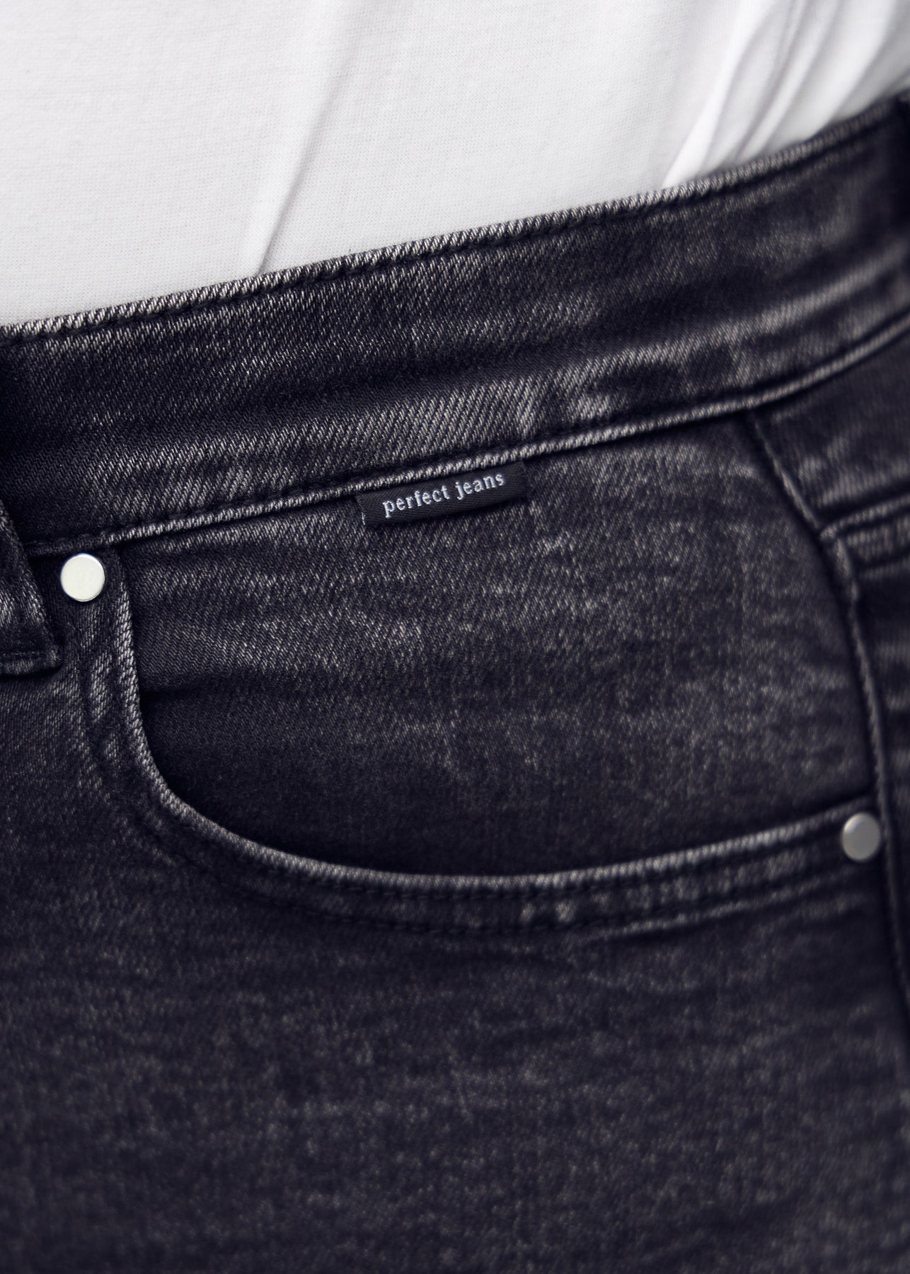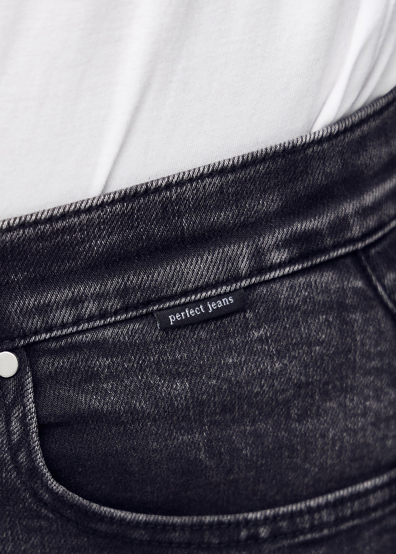 Nærbillede af mørkegrå denim med Perfect Jeans logoetiket ved forlommekanten.