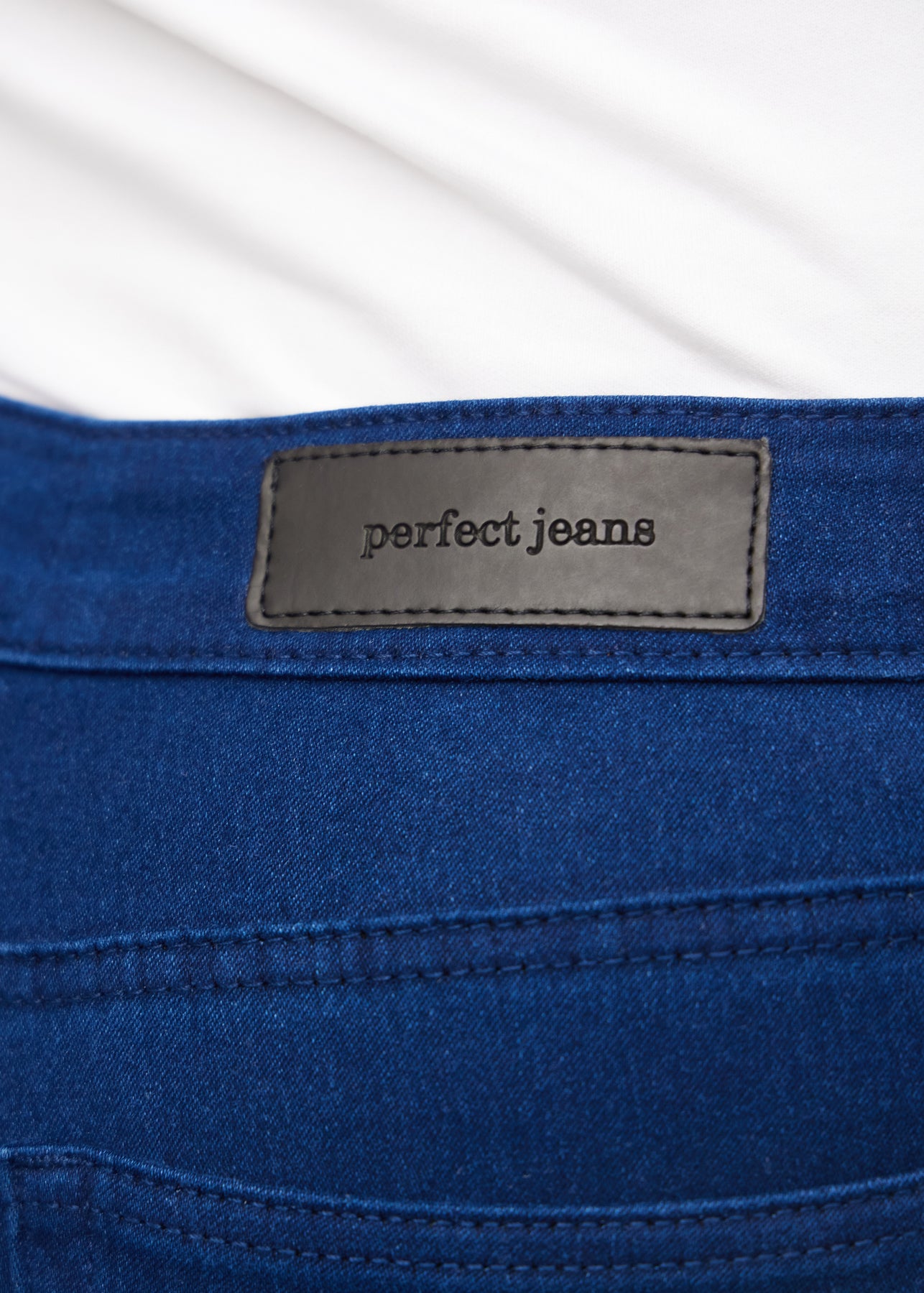 Nærbillede af mørkeblåt jeansmateriale med Perfect Jeans læderpatch bagpå i taljen.